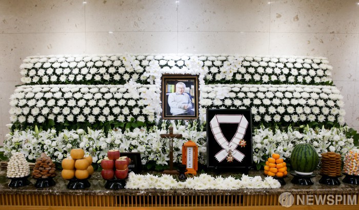 [서울=뉴스핌] 사진공동취재단 = 26일 서울 송파구 풍납동 서울아산병원 장례식장에 마련된 고(故) 이순재의 빈소에 금관문화훈장(1등급)이 놓여져 있다. 정부는 지난 25일 문화예술 발전과 국민 문화 향유에 기여한 공적을 기려 금관문화훈장(1등급)을 추서했다. 2025.11.26 photo@newspim.com