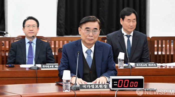 [서울=뉴스핌] 윤창빈 기자 = 이종석 국가정보원장이 26일 서울 여의도 국회에서 열린 정보위원회 전체회의에 자리하고 있다. 2025.11.26 pangbin@newspim.com