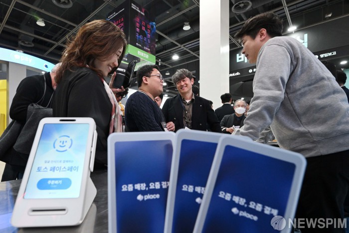 [서울=뉴스핌] 김학선 기자 = 26일 서울 서초구 aT센터에서 열린 코리아 핀테크 위크 2025에 마련된 토스 부스에서 참가자들이 얼굴 인식 기반 결제 서비스 '페이스페이' 등 다양한 결제 시스템을 체험하고 있다. 역대 최대 규모인 128개 기업·기관이 참여하는 이번 박람회는 '핀테크×AI, 금융에 취향을 더하다'를 주제로 3일간 진행된다. 2025.11.26 yooksa@newspim.com