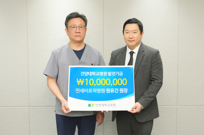 이날 원유건 연세바로척병원장은 건양대병원 정형외과 발전과 후학 양성을 위해 사용해달라는 뜻을 전하며 발전기금 1000만 원을 기부했다.