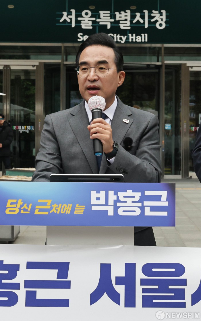 [서울=뉴스핌] 양윤모 기자 = 박홍근 더불어민주당 의원이 26일 오후 서울시청 앞에서 내년 6월 3일 치러지는 서울시장 출마를 선언하고 있다. 더불어민주당 원내대표를 역임한 4선 중진 박홍근 의원은 민주당 내 서울시장 출마를 가장 먼저 공식화 했다. 이 자리에서 박 의원은 현 서울시정의 문제를 3불(불안정·불균형·불평등)로 규정하고, '서울의 성장 동력 제고 방안' 등을 제시했다. 2025.11.26 yym58@newspim.com