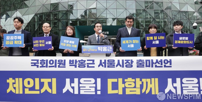 [서울=뉴스핌] 양윤모 기자 = 박홍근 더불어민주당 의원이 26일 오후 서울시청 앞에서 내년 6월 3일 치러지는 서울시장 출마를 선언하고 있다. 더불어민주당 원내대표를 역임한 4선 중진 박홍근 의원은 민주당 내 서울시장 출마를 가장 먼저 공식화 했다.이 자리에서 박 의원은 현 서울시정의 문제를 3불(불안정·불균형·불평등)로 규정하고, '서울의 성장 동력 제고 방안' 등을 제시했다. 2025.11.26 yym58@newspim.com