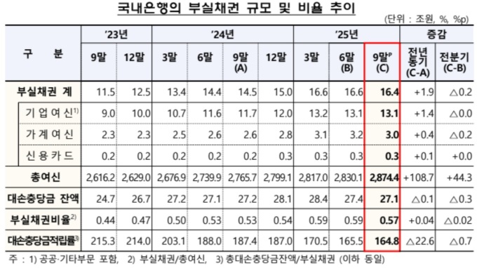 부실채권은 2000억원 감소한 16조4000억원으로 기업여신 13조1000억원, 가계여신 3조원, 신용카드채권 3000억원 순이다.