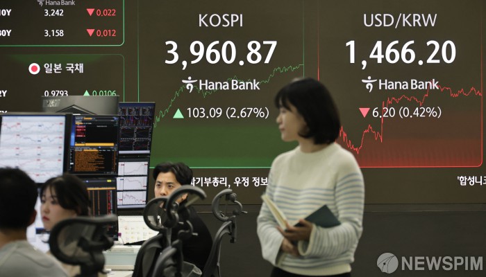 [서울=뉴스핌] 양윤모 기자 = 26일 오후 코스피가 전장 종가보다 103.09 포인트(2.67%) 상승하며 3960.87로, 코스닥은 21.29 포인트(2.49%) 상승한 877.32로 장을 마감한 가운데, 서울 중구 하나은행 딜링룸에서 직원들이 업무를 보고 있다. 서울외환시장에서 달러/원 환율은 전장 대비 6.20원 하락한 1466.20원에 주간거래를 마감했다. 2025.11.26 yym58@newspim.com