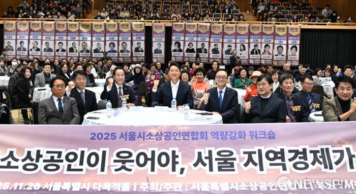 [서울=뉴스핌] 양윤모 기자 = 오세훈 서울시장이 26일 오후 서울시청 다목적홀에서 개최된 '2025 서울시소상공인연합회 역량강화 워크숍' 행사에 참석해 특강후 참석자들과 퍼포먼스를 하고 있다. 2025.11.26 yym58@newspim.com