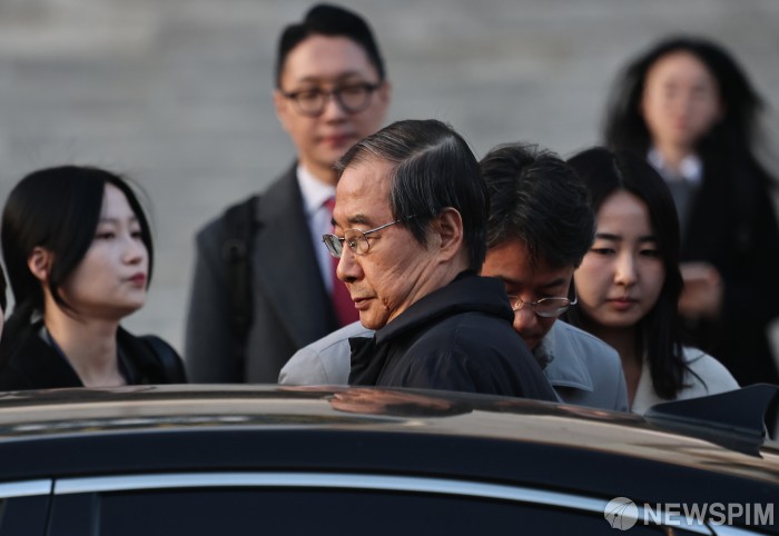 [서울=뉴스핌] 류기찬 기자 = 한덕수 전 국무총리가 26일 오후 서울 서초구 서울중앙지법에서 열린 내란 방조 및 내란 중요임무 종사 혐의 관련 결심공판을 마친 뒤 법원을 나서고 있다. 2025.11.26 ryuchan0925@newspim.com