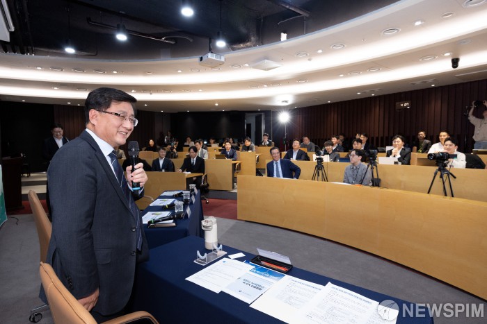 [서울=뉴스핌] 김성환 기후에너지환경부장관이 26일 서울 여의도 유진투자증권 본사 HRD센터에서 열린 녹색금융 타운홀 미팅에 참석해 국가 온실가스 감축목표(NDC) 달성과 녹색전환(K-GX) 촉진을 위한 금융의 역할에 대해 논의하고 있다. [사진=기후에너지환경부] 2025.11.26 photo@newspim.com