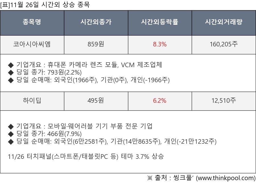 [표]11월 26일 시간외 상승 종목 및 최근 동향