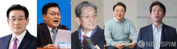 | 민주당 충북지사 후보군.(왼쪽부터 송기섭 진천군수, 신용한 대통령 직속 지방시대위원회 부위원장. 노영민 전 대통령비서실장, 한범덕 전 청주시장, 이인영 국회의원) |