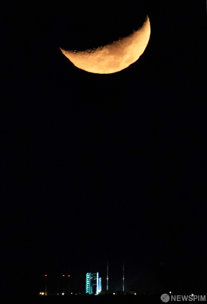 [여수=뉴스핌] 최지환 기자 = 26일 밤 여수 금오도에서 바라본 한국형발사체 누리호 뒤로 초승달이 지고 있다. 2025.11.26 choipix16@newspim.com