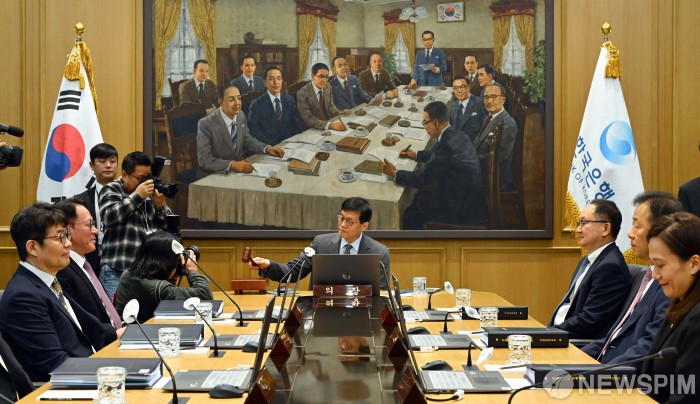 [서울=뉴스핌] 양윤모 기자 = 이창용 한국은행 총재가 27일 오전 서울 중구 한국은행 본관에서 열린 올해 마지막 금융통화위원회 본회의에서 회의를 알리는 의사봉을 두드리고 있다. 한은 금통위는 회의에서 기준금리를 4연속 연 2.50%로 동결했다. [공동취재] 2025.11.27 yym58@newspim.com