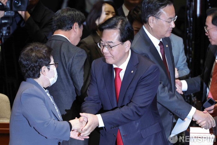 [서울=뉴스핌] 윤창빈 기자 = 송언석 국민의힘 원내대표가 27일 서울 여의도 국회에서 열린 의원총회에 참석하고 있다. 2025.11.27 pangbin@newspim.com