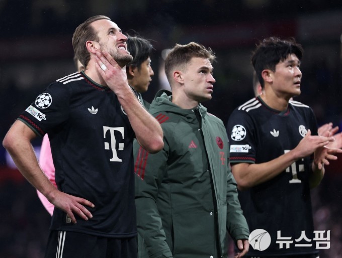 | [런던 로이터=뉴스핌] 박상욱 기자= 김민재(오른쪽)를 비롯한 뮌헨 선수들이 27일(한국시간) UEFA 챔피언스리그(UCL) 리그 페이즈 5차전에서 패한 뒤 원정 온 뮌헨팬에게 씁쓸한 표정으로 인사하고 있다. 2025.11.27 psoq1337@newspim.com |