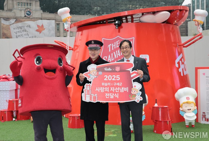 [서울=뉴스핌] 이길동 기자 = 이경우 휘슬러코리아 대표(오른쪽)와 김병윤 한국 구세군 사령관이 27일 서울 중구 서울광장에서 열린 2025 휘슬러X구세군 '사랑의 레시피 팟' 자선냄비 전달식에서 기부 보드를 들고 기념촬영을 하고 있다. 2025.11.27 gdlee@newspim.com