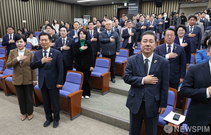 [서울=뉴스핌] 윤창빈 기자 = 정청래 더불어민주당 대표, 김병기 원내대표 등 소속 의원들이 27일 서울 여의도 국회에서 열린 의원총회에서 국민의례를 하고 있다. 2025.11.27 pangbin@newspim.com