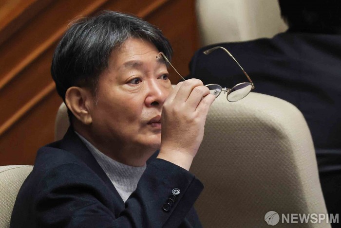 [서울=뉴스핌] 윤창빈 기자 = 이춘석 무소속 의원이 27일 서울 여의도 국회에서 열린 본회의에서 안경을 고쳐쓰고 있다. 2025.11.27 pangbin@newspim.com