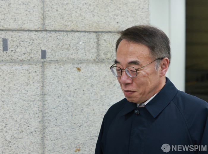 [서울=뉴스핌] 김학선 기자 = '사법농단' 의혹을 받는 임종헌 전 법원행정처 차장이 27일 서울 서초구 서울고등법원에서 열린 직권남용 권리행사 방해 등 혐의 항소심 선고공판을 마치고 청사 밖으로 나서고 있다. 임 전 법원행정처 차장은 2심 항소심 선고공판에서 징역 2년, 집행유예 3년을 선고 받았다. 2025.11.27 yooksa@newspim.com