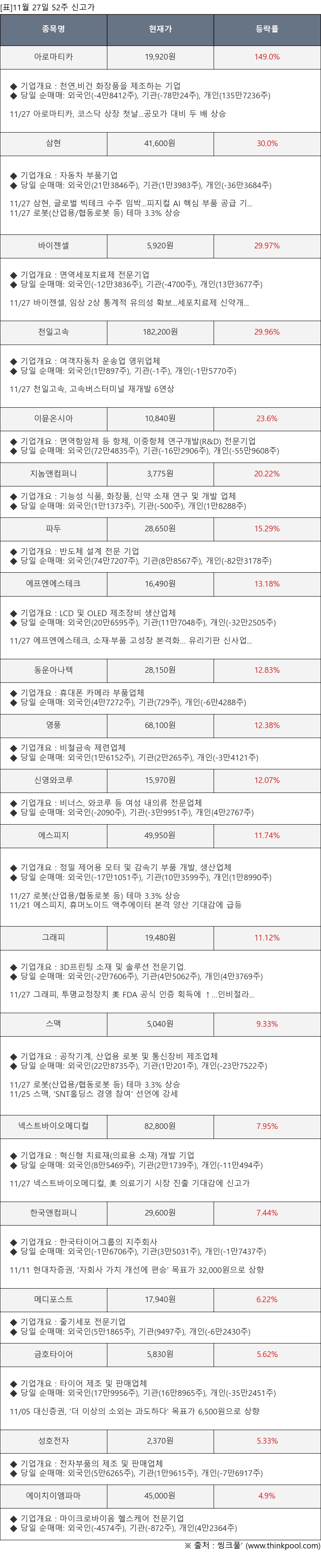 ※ 관련 종목: 아로마티카, 삼현, 바이젠셀, 천일고속, 이뮨온시아, 지놈앤컴퍼니, 파두, 에프엔에스테크, 동운아나텍, 영풍, 신영와코루, 에스피지, 그래피, 스맥, 넥스트바이오메디컬, 한국앤컴퍼니, 메디포스트, 금호타이어, 성호전자, 에이치이엠파마