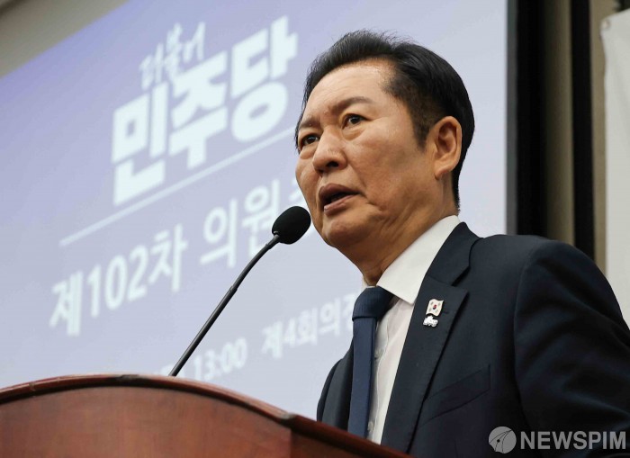 [서울=뉴스핌] 윤창빈 기자 = 정청래 더불어민주당 대표가 27일 서울 여의도 국회에서 열린 의원총회에서 모두발언을 하고 있다. 2025.11.27 pangbin@newspim.com