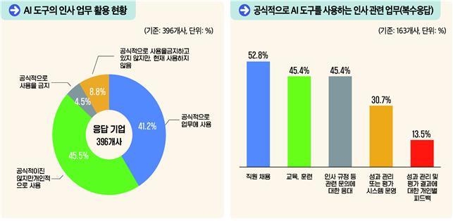 AI 도구를 공식적으로 인사 업무에 도입한 기업 수는 163개로, '직원 채용'(52.8%)에 사용하는 경우가 가장 많았다. 교육·훈련(45.4%), 인사 관련 문의 응대(45.4%) 등에서도 AI 기술이 활용됐다.