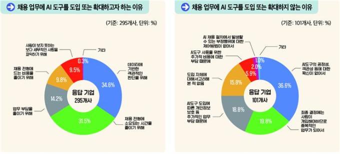 조사 참여 기업 가운데 295개사(74.5%)는 AI 도구를 도입·확대할 계획이 있다고 응답했다. AI 도입 및 확대 사유는 데이터 기반 객관적 판단(34.6%), 채용 전형 소요 시간 감축(31.5%), 업무 부담 감소(14.2%) 등이었다.