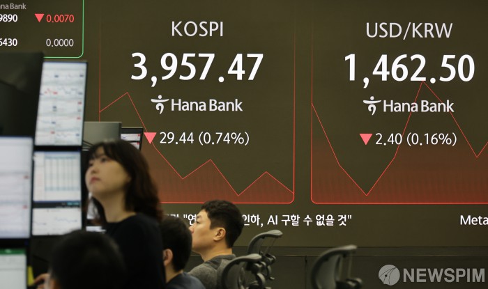 [서울=뉴스핌] 양윤모 기자 = 산업생산 지표가 한 달 만에 감소세로 돌아선 가운데, 28일 오전 코스피가 전장 종가보다 29.44 포인트(0.74%) 하락하며 3957.47로, 코스닥은 19.57 포인트(2.22%) 상승한 899.73으로 장을 시작한 가운데, 서울 중구 하나은행 딜링룸에서 직원들이 업무를 보고 있다. 서울외환시장에서 달러/원 환율은 전장 대비 3.30원 하락한 1461.60원에 주간거래를 시작했다. 2025.11.28 yym58@newspim.com