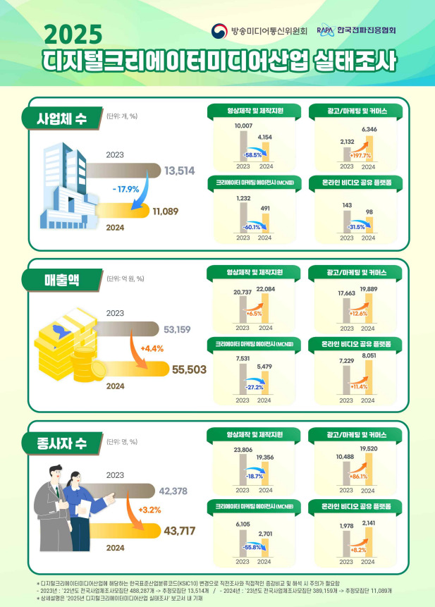 종사자 수는 총 4만3717명으로 3.2% 증가했다. 종사자 5인 미만 사업체가 85.7%(9504개)로 대부분을 차지했으며, 30대 이하 청년 종사자가 52.3%(2만3000명)로 절반을 넘었다. 분야별 종사자 수는 영상제작 및 제작지원 1만9356명, 광고·마케팅·커머스 1만9520명, MCN 등 2701명, 온라인 플랫폼 2141명이다.
