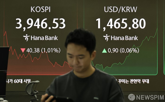 [서울=뉴스핌] 양윤모 기자 = 산업생산 지표가 한 달 만에 감소세로 돌아선 가운데, 28일 오전 코스피가 전장 종가보다 40.38 포인트(1.01%) 하락하며 3946.53으로, 코스닥은 19.57 포인트(2.22%) 상승한 899.73으로 장을 시작한 가운데, 서울 중구 하나은행 딜링룸에서 직원들이 업무를 보고 있다. 서울외환시장에서 달러/원 환율은 전장 대비 0.90원 상승한 1465.80원에 주간거래를 시작했다. 2025.11.28 yym58@newspim.com