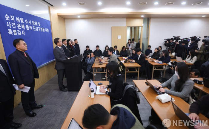 [서울=뉴스핌] 최지환 기자 = 채상병 순직 사건 외압·은폐 의혹을 수사해온 이명현 순직해병 특별검사가 28일 오전 서울 서초구 해병특검 사무실에서 열린 정례 브리핑에서 최종 수사 결과를 발표하고 있다. 2025.11.28 choipix16@newspim.com