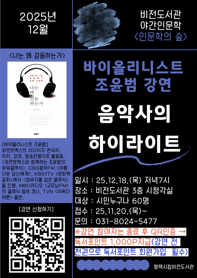 [평택=뉴스핌] 이성훈 기자 = 경기 평택시립 비전도서관이 오는 12월 18일 저녁 7시, 바이올리니스트 조윤범을 초청해 '음악사의 하이라이트'를 주제로 12월 야간 인문학 강좌를 개최한다.
