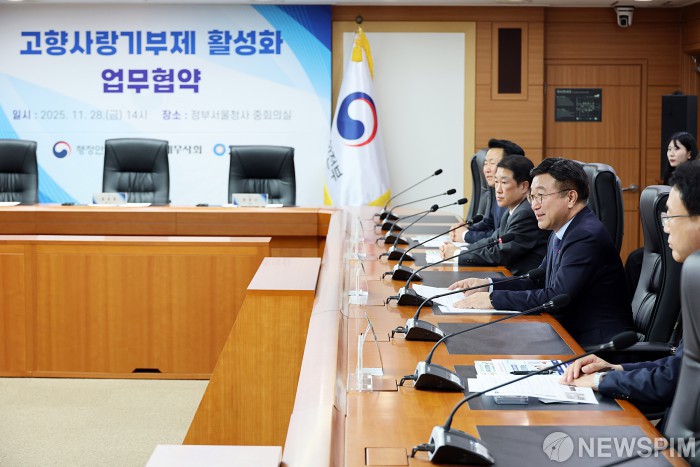 [서울=뉴스핌] 윤호중 행정안전부 장관이 28일 서울 종로구 정부서울청사에서 열린 고향사랑기부제 활성화를 위한 업무협약식에서 인사말을 하고 있다. [사진=행정안전부] 2025.11.28 photo@newspim.com