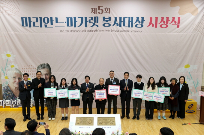 | 제5회 마리안느·마가렛 봉사대상 시상식 (왼쪽 여섯 번째부터 공영민 고흥군수, 대통령 표창 수상자 김태규 신부, 국무총리 표창 고(故) 조윤미 님의 남동생 조윤석)[사진=고흥군] 2025.11.28 chadol999@newspim.com |