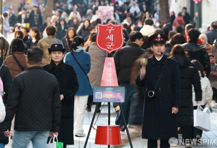 [서울=뉴스핌] 김학선 기자 = 2025 구세군 연말 모금 캠페인이 시작된 28일 서울 중구 명동거리에서 구세군 사관이 힘차게 종을 울리고 있다. 올해로 97번째를 맞는 구세군 연말 자선냄비 모금 캠페인은 'Light of Hope'(희망의 빛)을 주제로 전국 300여 곳에서 진행된다. 2025.11.28 yooksa@newspim.com