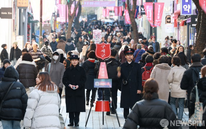 [서울=뉴스핌] 김학선 기자 = 2025 구세군 연말 모금 캠페인이 시작된 28일 서울 중구 명동거리에서 구세군 사관이 힘차게 종을 울리고 있다. 올해로 97번째를 맞는 구세군 연말 자선냄비 모금 캠페인은 'Light of Hope'(희망의 빛)을 주제로 전국 300여 곳에서 진행된다. 2025.11.28 yooksa@newspim.com