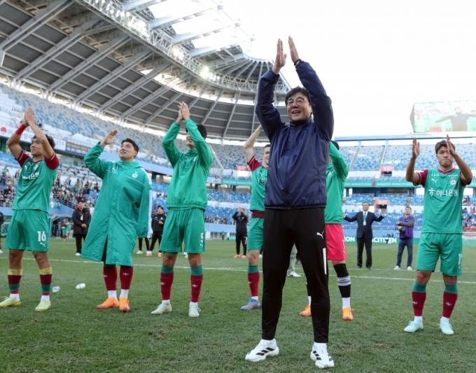 대전팬들에게 인사하는 대전 황선홍 감독과 선수들. [사진=한국프로축구연맹]