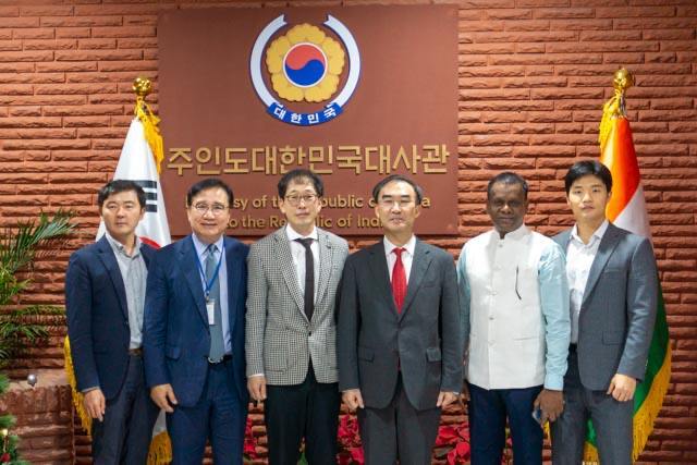 (왼쪽부터) 조성준 주인도대한민국대사관 상무관, 김동규 이엠앤아이 사외이사, 고창훈 이엠앤아이 대표, 이성호 주인도대한민국대사관 대사, 슈레쉬 이엠앤아이 인도 자문, 안한별 주인도대한민국대사관 서기관. [사진=이엠앤아이]