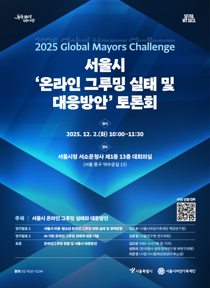 한편 시는 2일 서울시청에서 온라인 그루밍 대응 방안에 대한 토론회를 개최해 아동·청소년 성착취 문제에 대한 사회적 인식을 높이고, 예방 가이드를 배포할 예정이다.