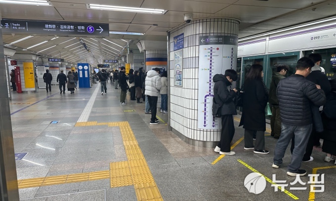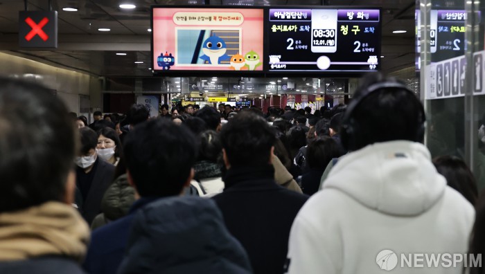 [서울=뉴스핌] 양윤모 기자 =1일 오전 서울 지하철 1∼8호선을 운영하는 서울교통공사의 노동조합이 임금·단체협상 결렬에 따른 대응으로 '준법운행'에 들어간 가운데, 동대문역사문화공원역에서 시민들이 출근을 위해 지하철을 기다리고 있다. 2025.12.01 yym58@newspim.com