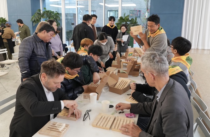 | 현대엔지니어링 기프트하우스 플랜비: 벌, 집을 짓다 전시회에서 참석자들이 야생벌집을 만들고 있다. [사진=현대엔지니어링] |