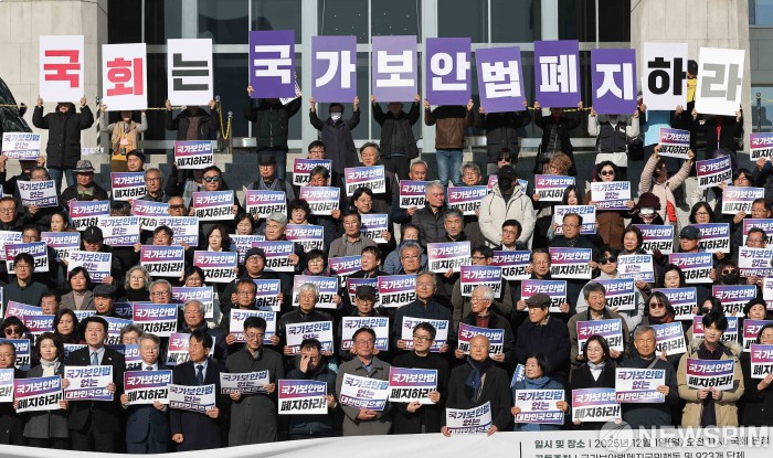[서울=뉴스핌] 윤창빈 기자 = 국가보안법폐지국민행동 등 시민사회 단체와 법안을 공동 발의한 민형배 더불어민주당 의원, 김준형 조국혁신당 의원, 윤종오 진보당 의원이 1일 서울 여의도 국회 본청 앞에서 열린 국가보안법 제정 77년, 22대 국회 국가보안법 폐지 법률안 발의 기자회견에서 피켓을 들고 있다. 2025.12.01 pangbin@newspim.com