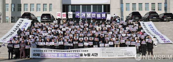 [서울=뉴스핌] 윤창빈 기자 = 국가보안법폐지국민행동 등 시민사회 단체와 법안을 공동 발의한 민형배 더불어민주당 의원, 김준형 조국혁신당 의원, 윤종오 진보당 의원이 1일 서울 여의도 국회 본청 앞에서 열린 국가보안법 제정 77년, 22대 국회 국가보안법 폐지 법률안 발의 기자회견에서 피켓을 들고 있다. 2025.12.01 pangbin@newspim.com