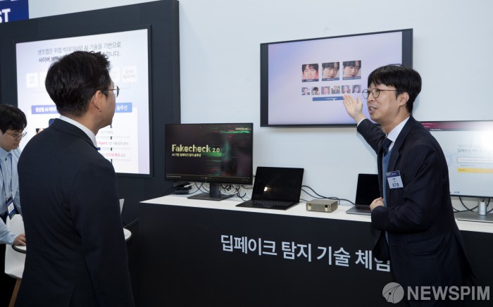 [서울=뉴스핌] 배경훈 부총리 겸 과학기술정보통신부 장관이 1일 오전 서울 강남구 코엑스에서 열린 '2025 인공지능(AI) 해킹방어대회' 에 참석해 전시부스에서 설명을 듣고 있다. [사진=과학기술정보통신부] 2025.12.01 photo@newspim.com