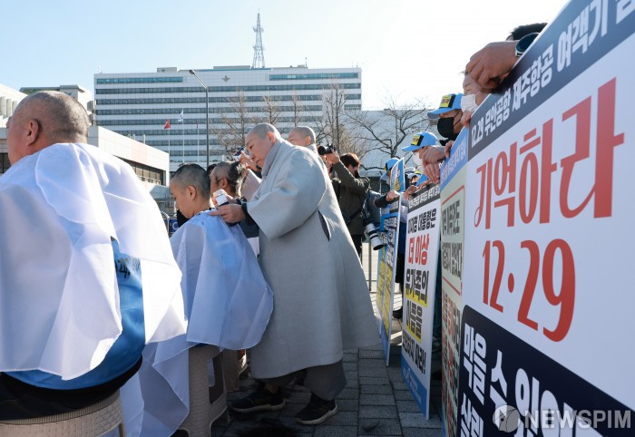 대통령실 앞에서 삭발하는 제주항공 여객기 참사 유가족들