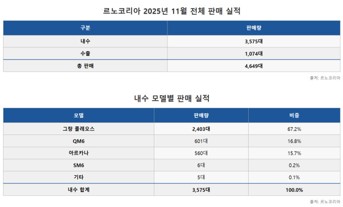 르노코리아의 스테디셀러 SUV 'QM6'와 중형 세단 'SM6'는 11월에 각각 601대, 6대가 판매되며 약 9년간 이어온 국내 판매에 마침표를 찍었다. 두 차종은 2016년 동시에 국내 시장에 데뷔한 이후 두 차례의 부분변경을 거치며 라인업을 유지해 왔다. 특히 QM6는 특허 받은 마운팅 시스템을 적용한 LPG 모델 'QM6 LPe'를 앞세워 LPG SUV 대중화를 이끈 모델로, 누적 국내 판매는 258000대에 육박한다. 세단 시장에서 감각적인 디자인과 다양한 파워트레인을 선보였던 SM6 역시 국내에서 15만7000여 대가 판매됐다.