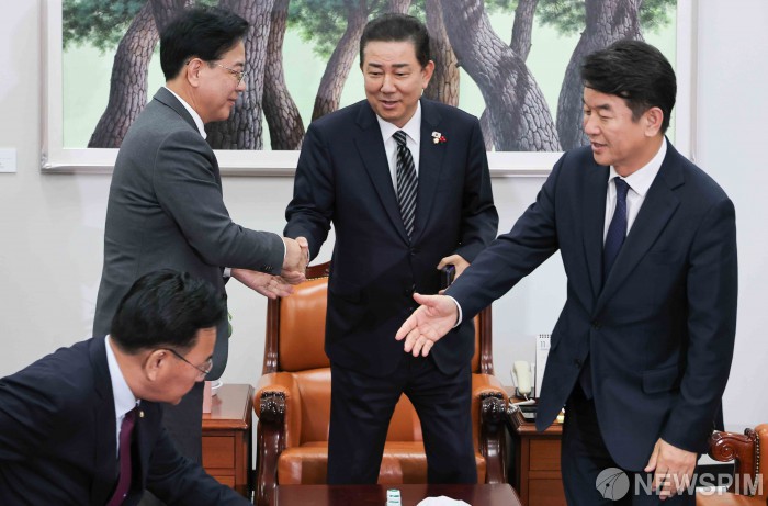 [서울=뉴스핌] 윤창빈 기자 = 김병기 더불어민주당 원내대표, 송언석 국민의힘 원내대표가 1일 서울 여의도 국회에서 내년도 예산안 협의에 앞서 인사를 나누고 있다. 2025.12.01 pangbin@newspim.com