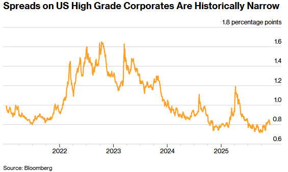 미국 투자등급 회사채의 스프레드는 금요일 평균 약 0.8%포인트, 즉 80베이시스포인트였다. 블룸버그 지수 데이터에 따르면 지난 20년간 평균은 1.48%포인트에 가깝다. 이들 채권은 금요일까지 올해 약 8% 상승했다.