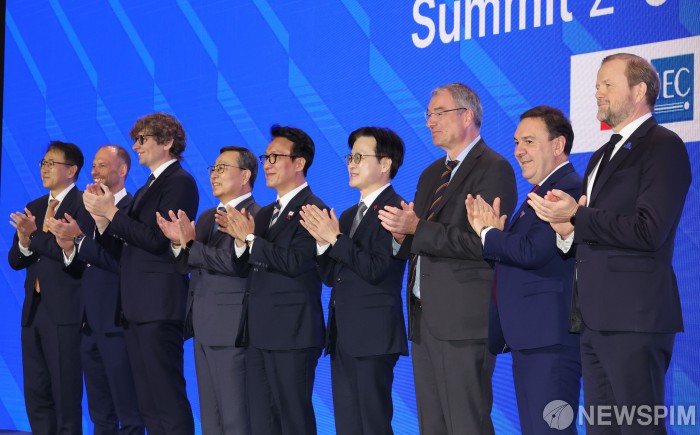 [서울=뉴스핌] 청사사진기자단 = 김민석 국무총리가 2일 오전 서울 중구 신라호텔에서 열린 2025 국제 AI 표준 서밋 개회식에서 주요 참석자들과 기념촬영을 하고 있다. 왼쪽부터 김상부 디지털전환 부총재, 앤드류 스테인스 WIPO 사무차장보, 토마스 라마나우스카스 ITU 사무차장, 조성환 ISO 회장, 김민석 총리, 김정관 산업통상부 장관, 조 콥스 IEC 회장, 장-마리 포감 WTO 사무차장, 비욘 베르게 유럽평의회 사무차장. 2025.12.02 photo@newspim.com .