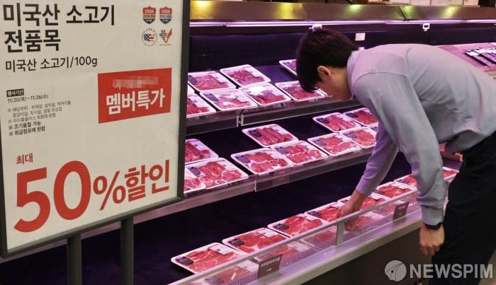 [서울=뉴스핌] 양윤모 기자 = 한우 대신 '가성비 소고기'로 즐겨 찾는 미국산 소고기 가격이 상승세를 보이고 있는 가운데, 24일 서울 시내 한 대형마트에서 미국산 소고기를 구입하고 있다. 21일 축산물품질평가원 축산유통 정보에 따르면 지난달 미국산 냉동 갈비 소비자 가격은 100g당 4435원으로 전년 4304원 대비 3%, 평년 3718원 대비 19.3% 높아졌으며 대형마트 기준으로는 1년 새 가격이 20%가량 상승했다. 이 같은 가격 상승의 가장 큰 배경으로는 미국 현지에서 소 사육 규모가 급감으로 전해졌다. 2025.11.24 yym58@newspim.com