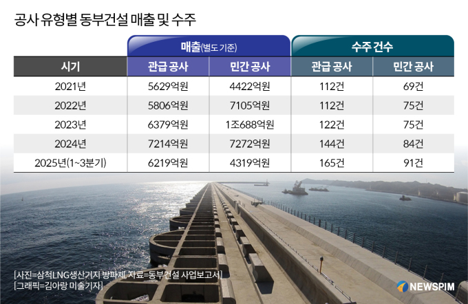 2일 업계에 따르면 올해 3분기(누적) 동부건설의 공공공사 매출(별도기준)은 6191억원으로 나타났다. 해당 매출은 2023년 3분기 4600억원, 2024년 3분기 4949억원에 이어 상승폭이 커졌다. 같은 기간 민간공사 매출이 2023년 3분기 7934억원, 2024년 3분기 5952억원, 올해 3분기 4319억원으로 하락세인 것과 대비된다. 특히 토목 분야 공공공사 매출은 전체 매출에서 차지하는 비중이 28.4%(3510억원)로 가장 높다.