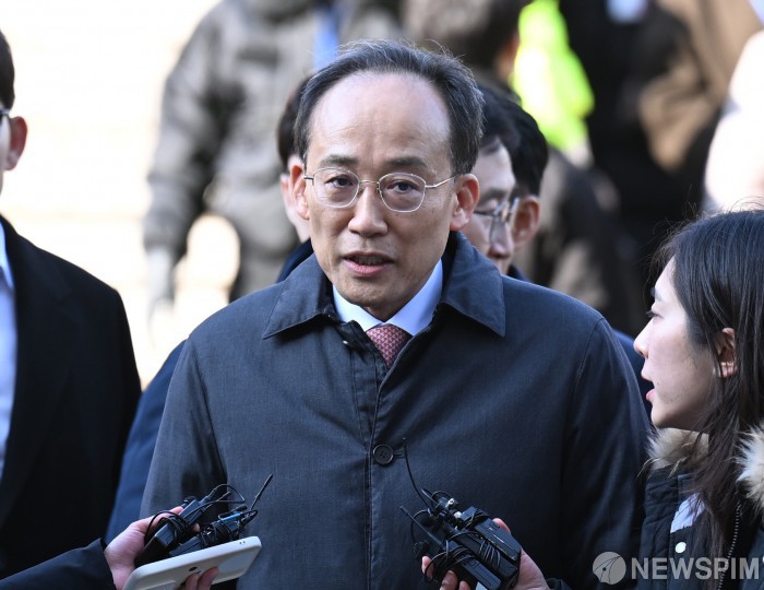 [서울=뉴스핌] 최지환 기자 = 추경호 국민의힘 의원이 2일 서울 서초구 서울중앙지방법원에서 열린 구속 전 피의자 심문(영장실질심사)에 출석하며 입장을 밝히고 있다. 2025.12.02 choipix16@newspim.com
